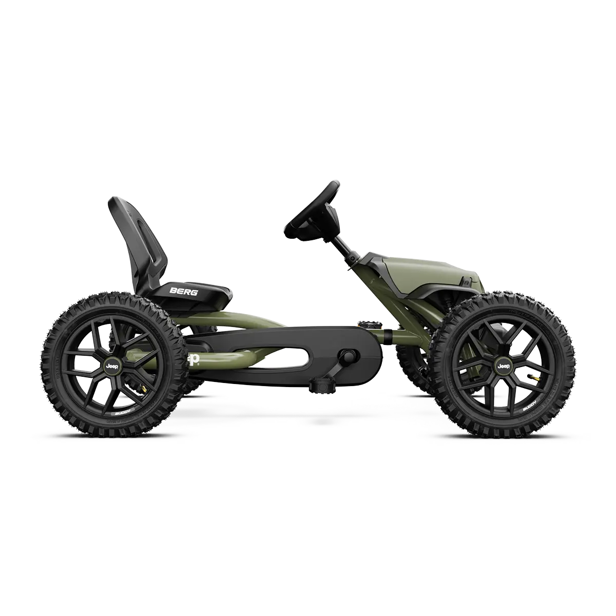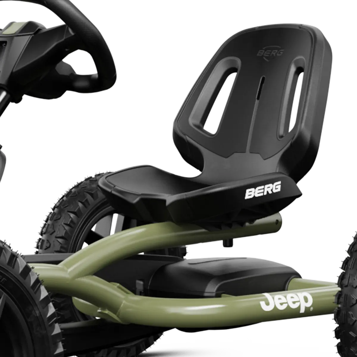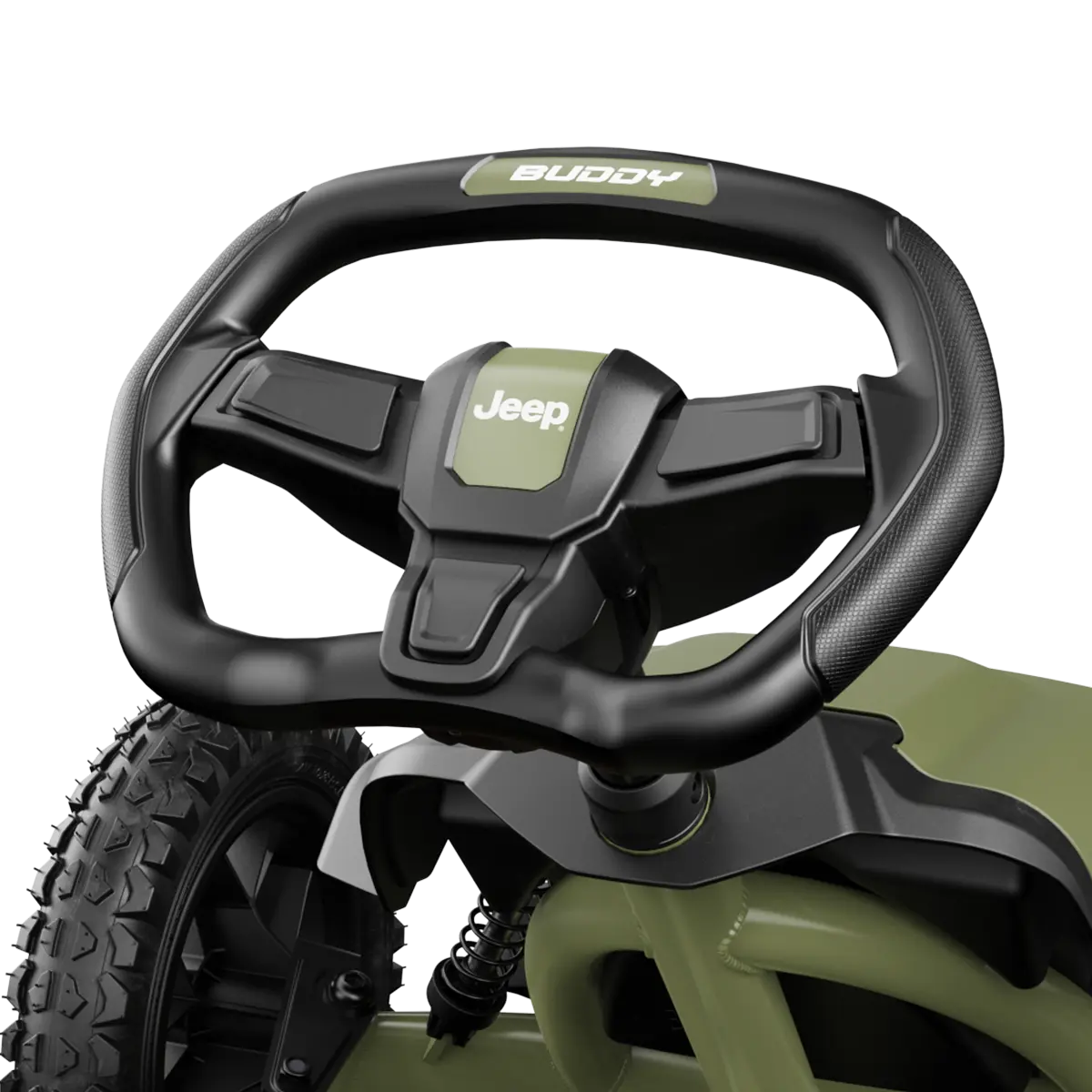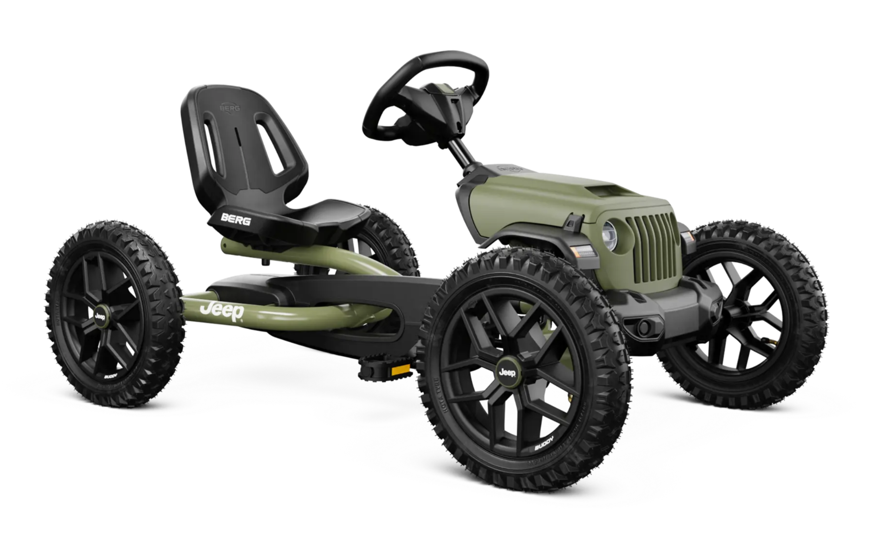 Own a real Jeep® go-kart for the youngest adventurers! This go-kart can tackle any surface thanks to its tough all-terrain tyres. The seat and steering are adjustable for years of playtime pleasure. This go-kart also has a unique BFR system that is asy to pedal, supple and fast. The Buddy can be ridden forwards, braked and ridden backwards with ease.